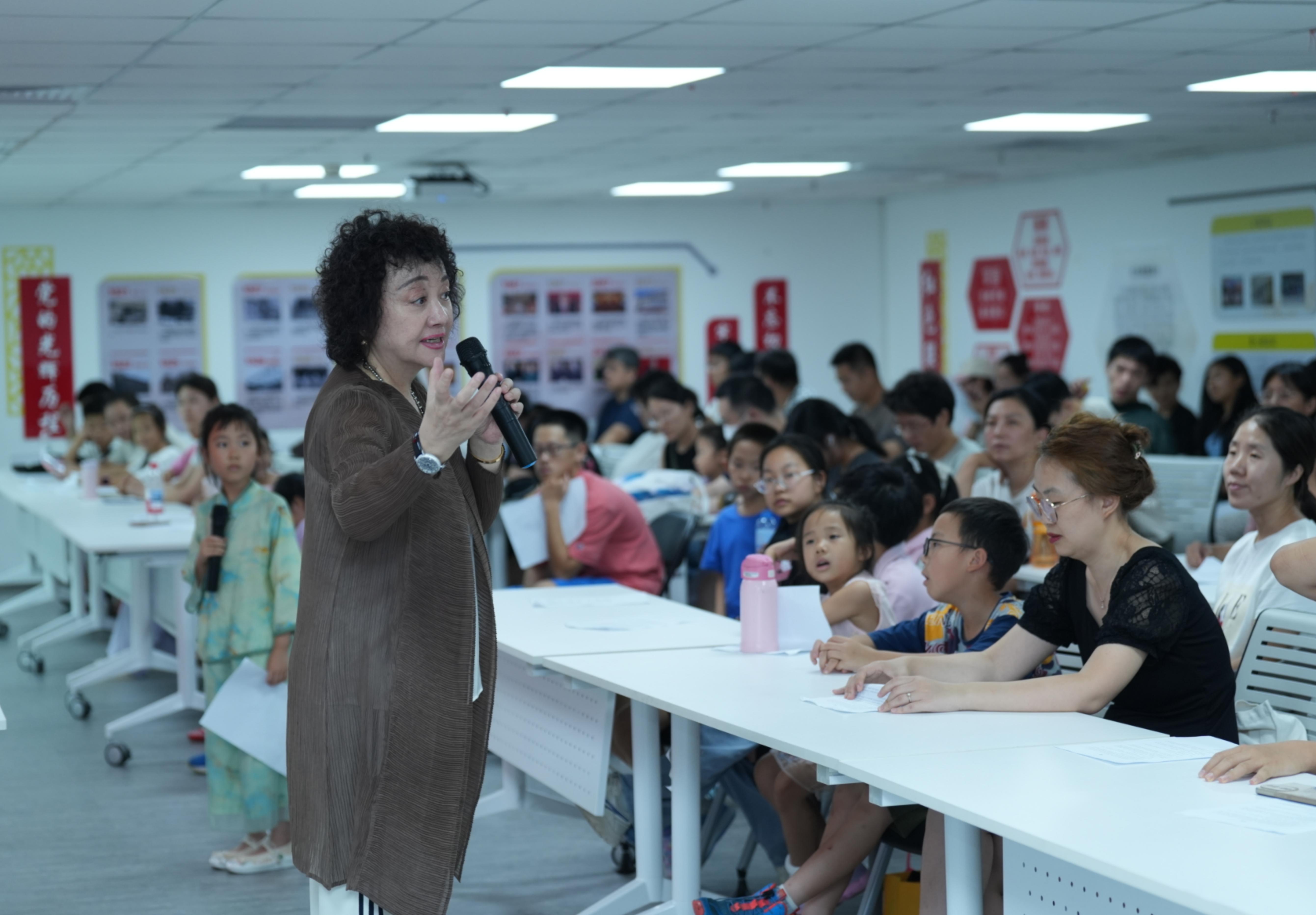 此次活动由北京市海淀区文化和旅游局指导、北京市海淀区图书馆支持、共青团北京市海淀区委员会主办。讲座中,姚美含以专业的艺术素养和丰富的舞台经验,引领青少年们走进声音艺术的世界。她从最基本的"八百标兵奔北坡"练声开始,示范了如何通过语调、节奏、停顿等朗诵技巧,准确传达文章的情感内涵和精神内核。她还详细讲解了如何把握叙事节奏、如何呈现情感转折点以及如何通过声音塑造画面感,并通过系统的发声训练和肢体放松练习,帮助孩子们打开了声音通道,释放了表达潜能。